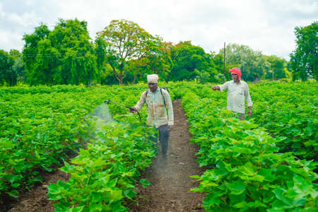 young indian farmer spraying at field