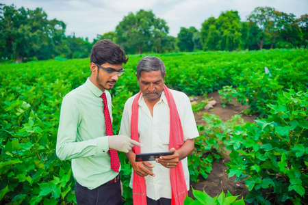 Young Indian farmer with agronomist at Cotton field , showing some information on tab