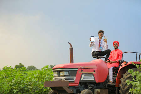 Young indian farmer and bank officer sitting on new tractor and officer showing mobile screen at agriculture field