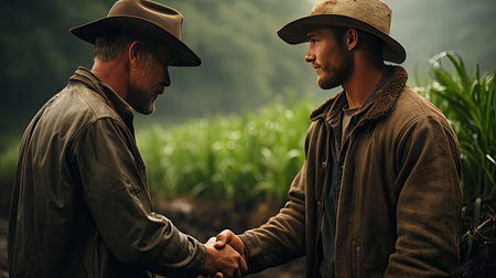 Two farmers talk on the field, then shake hands. Agriculture environment illustration. Generative AI art