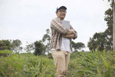 Successful Asian male farmer supervise his ginger plants cultivation. Organic farming