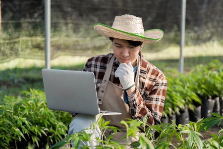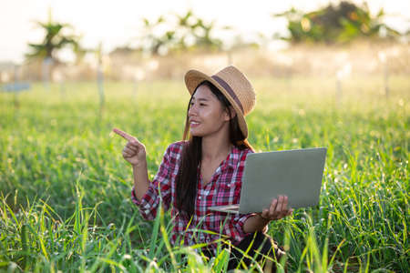 Asian young female agriculturist using laptop to recording growth data of many little green Chinese cabbage in organic farm