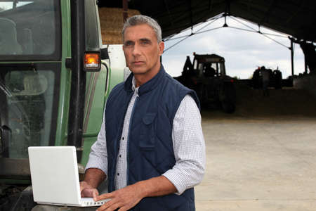 Farmer with laptop stood by tractor