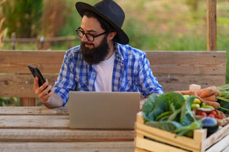 Young farmer entrepreneur sell his organic eco-friendly veggies online using laptop while sitting at a wooden table in his garden