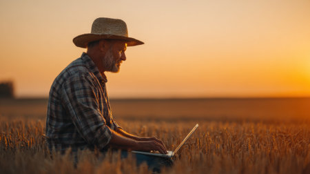 A farmer is focused on his laptop while sitting in a wheat field during sunset. The warm light and golden grains create a serene atmosphere, blending tradition with technology.