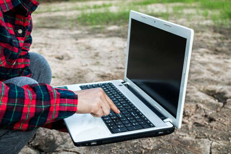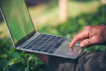 Smart farmer using laptop in eco green farm sustainable quality control. Close up Hand typing laptop computer quality control plant tree. Farmer hands using technology in eco Farmland biotechnology
