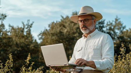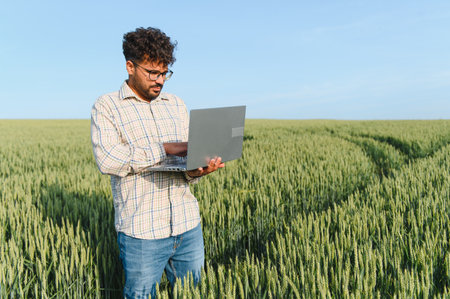 Farmer using laptop in wheat field, implementing modern technology for efficient crop management and sustainable agriculture practices