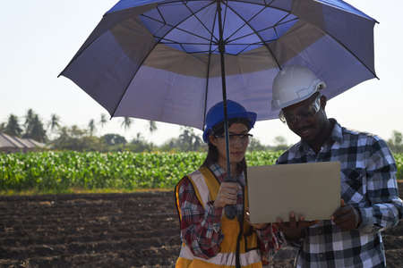 A black male engineer and a helper holding a laptop and discussing the outdoor land survey for industrial factory construction.