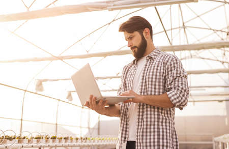 Farmer with laptop working in hydroponic glasshouse