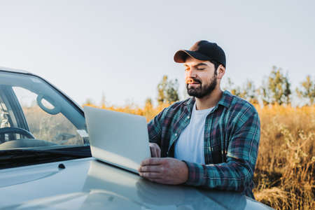 Young latin farmer man on his pickup truck and working on his laptop. Agricultural concept.