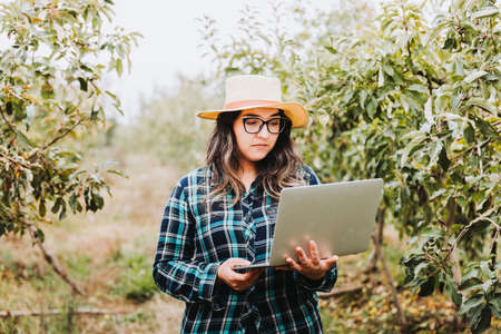 Young latin farmer woman using a laptop to control the production of her farmland.