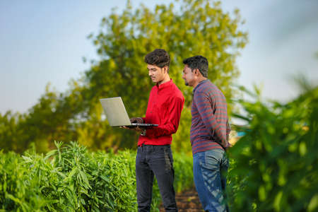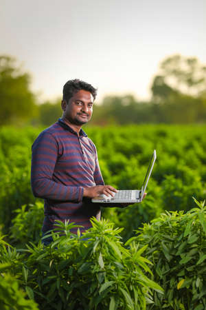 Indian farmer using a laptop at agriculture field