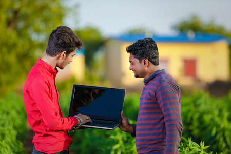 Technology and people concept : Young indian farmer using laptop at field