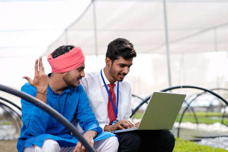 Young indian agronomist showing some information to farmer in laptop at greenhouse