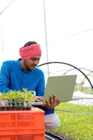 Young indian farmer using laptop at greenhouse or polyhouse