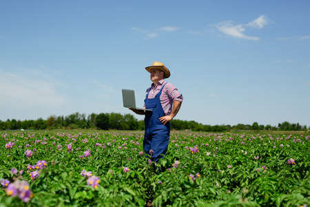 The concept of modern technologies in agribusiness. An agronomist works on a laptop in the middle of a field.