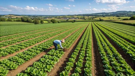 Aerial view of a young man working in a lettuce field in summer