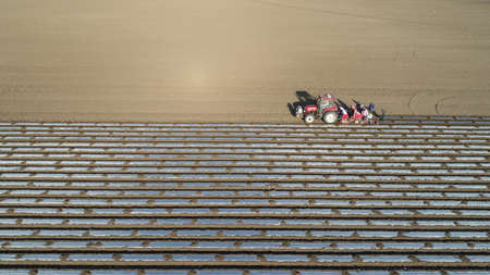 Aerial view Tractor Hilling Potatoes with disc hiller. Farmer in tractor preparing land with seedbed cultivator in farmlands. Tractor plows a field. Agricultural work in processing, cultivation of land. Farmers preparing land and fertilizing. Agricultural workers with tractors.