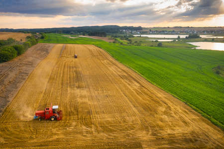 Harvesting time. Agriculture. Agricultural industry. Aerial view of combine harvester in field
