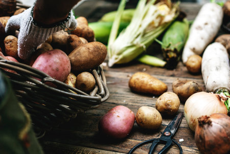 Closeup of hand arrange potatoes on wooden table