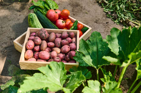 Wooden crate with harvested potatoes stacked on a box with a crop of tomatoes, cucumbers, zucchini and chard leaves
