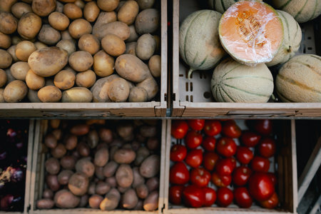 Vibrant arrangement of fresh vegetables including tomatoes, potatoes, and leafy greens, ideal for healthy eating themes.