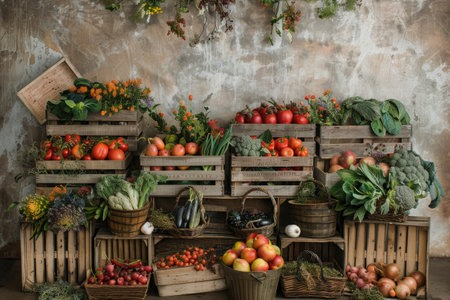 A farmers market produce fresh vegetable organic food colorful harvest rustic stall natural light local produce seasonal vegetable. vibrant rustic