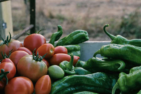 Fresh crops from the kitchen garden harvest, mature red tomatoes and green sweet peppers