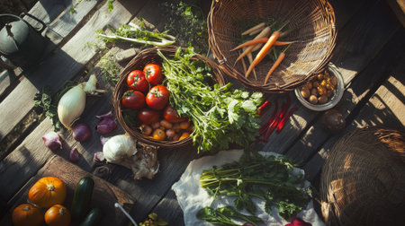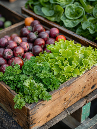 Local produce with lush greens and warm light set on rustic wood, ideal for farm-to-table, nature or healthy food visuals