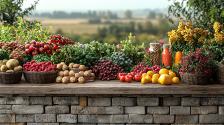 Indulge in the beauty of a farm-to-table feast captured in this microstock-worthy image. A visually stunning spread of fresh, colorful fruits, vegetables, and flowers is artfully arranged on a rustic wooden table, set against the backdrop of the great outdoors. The image perfectly captures the essence of a bountiful harvest, with its vibrant textures and rich colors. The art style is clean and modern, with crisp details and soft lighting that beautifully enhances the natural beauty of the produce.