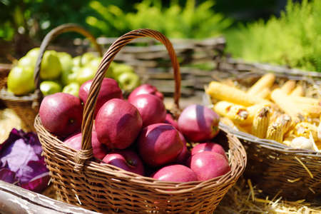 Fruits and vegetables for sale on street stall in the market. Ripe organic apples and corn in wicker baskets in local farmer market. Small business. Homegrowing produce. Traditional agricultural fair.