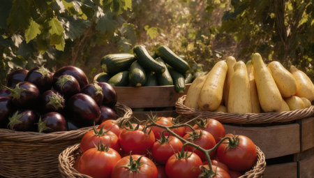A vibrant assortment of ripe tomatoes, glossy eggplants, crisp cucumbers, and yellow squash arranged in woven baskets, showcasing a bountiful harvest.