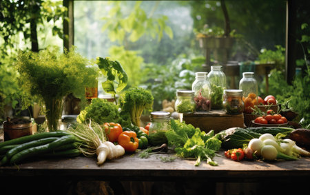 Healthy food and vegetables on a wooden table in the countryside.