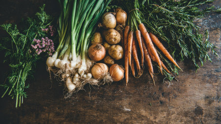 An assortment of fresh organic vegetables including green onions, carrots, potatoes, and herbs, beautifully arranged on a rustic wooden table, ideal for healthy recipes.