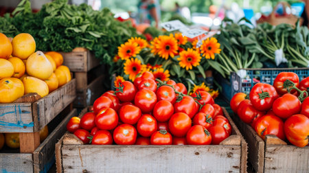 Vivid red tomatoes on display at a farmers market, capturing the essence of organic and fresh farm produce ready for purchase