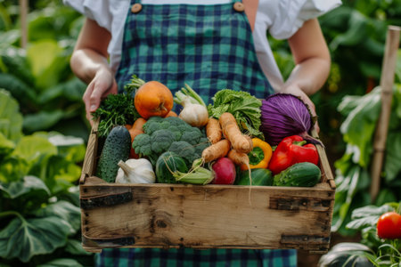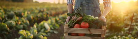 Farmer gathering and holding wooden box full of fresh, raw vegetables on farm. Growing organic food concept, grocery produce. Basket with vegetables in the farmer hands. Realistic style photo