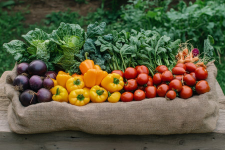 A charming collection of vibrant vegetables is neatly arranged in burlap sacks along a rustic wooden structure. The lush greenery in the background adds to the serene atmosphere of the garden.