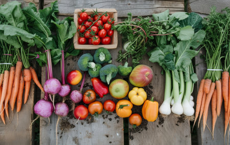 Colorful assortment of fresh vegetables spread on rustic wooden crates. A perfect capture of healthy and vibrant produce, great for food enthusiasts and gardeners. Generated A.I.