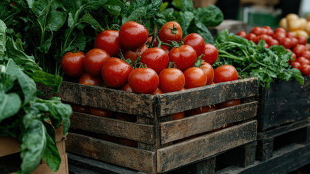 Fresh tomatoes and leafy greens in wooden crates at a farmers market.