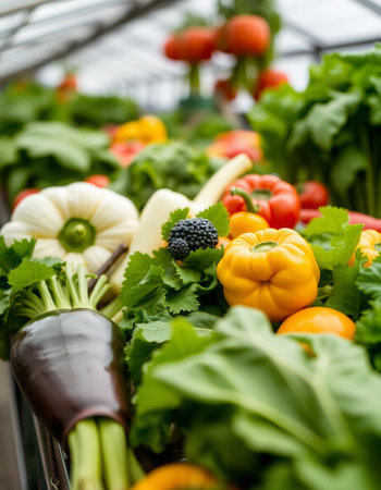 Variety of fresh vegetables in a greenhouse. Selective focus.