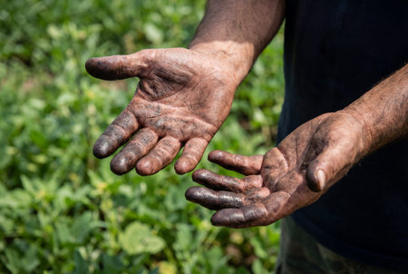 A close-up view of a farmer's hands deeply engaged in cultivating soil, showcasing the textured and earthy tones of the dirt, emphasizing hard work and connection to nature.
