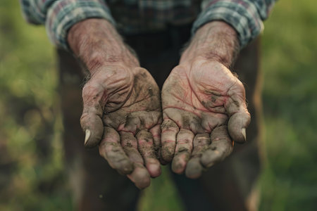 Closeup of a farmers hands, soiled and lined from hard work in the fields