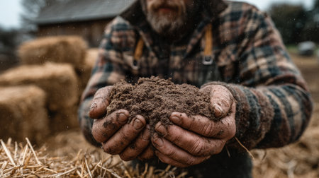 A close-up of a farmer's hands gently cradling rich, dark soil, symbolizing the essence of agriculture, hard work, and connection to the land.