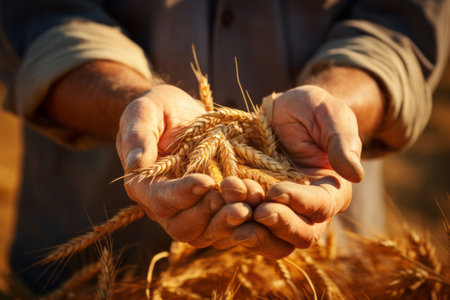 Photo of hands holding grains, focus on the texture and color of wheat with blurred background of farmland. Generated by artificial intelligence.