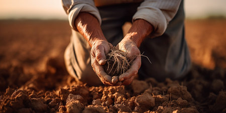 A farmer's hands cradle rich, dark soil, symbolizing the connection between human effort and agricultural growth in a natural setting.