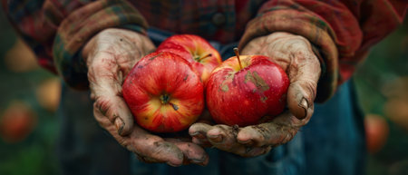 Freshly harvested apples. Farmers hands holding organic fruits and vegetables.