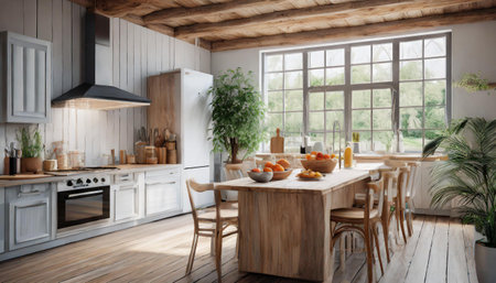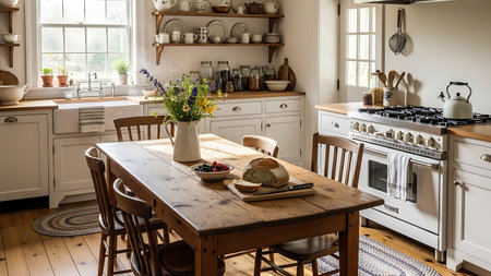 cozy, well-lit kitchen with a rustic wooden table set with bread and plants, surrounded by modern amenities