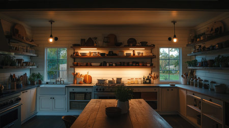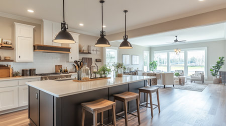 Warm kitchen gathering modern home interior design bright atmosphere wide angle culinary joy