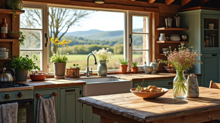Rustic kitchen with scenic view and wooden accents in cozy sunlit home. That the image is generated using AI.