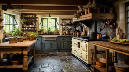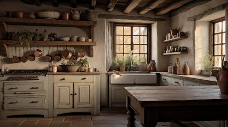 rustic cottage kitchen with simple yet classic design, and vintage appliances, created with generative ai
